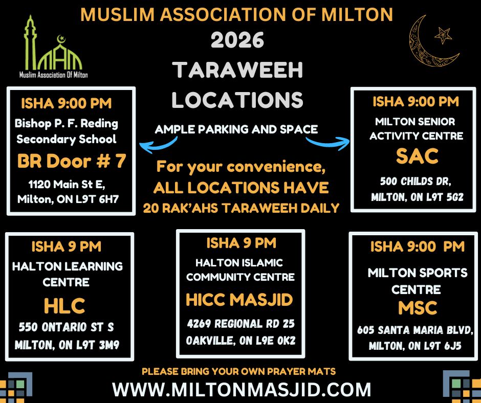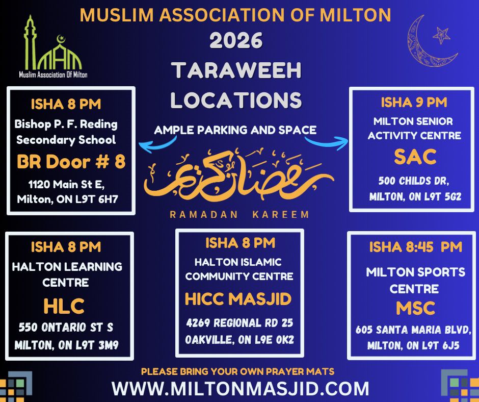 The Muslim Association of Milton (MAM) has been serving the Muslim Community of Milton for over a decade. Today, Halton Islamic Community Centre (HICC) Masjid and Halton Learning Centre (HLC) Musala are open and providing multiple services to the surrounding Muslim communities of Milton, Oakville, and Burlington. MAM has contributed to shaping Milton’s dynamic character for years and is poised to contribute to the growth and prosperity of Milton, Halton Region and Canada, Inshallah.